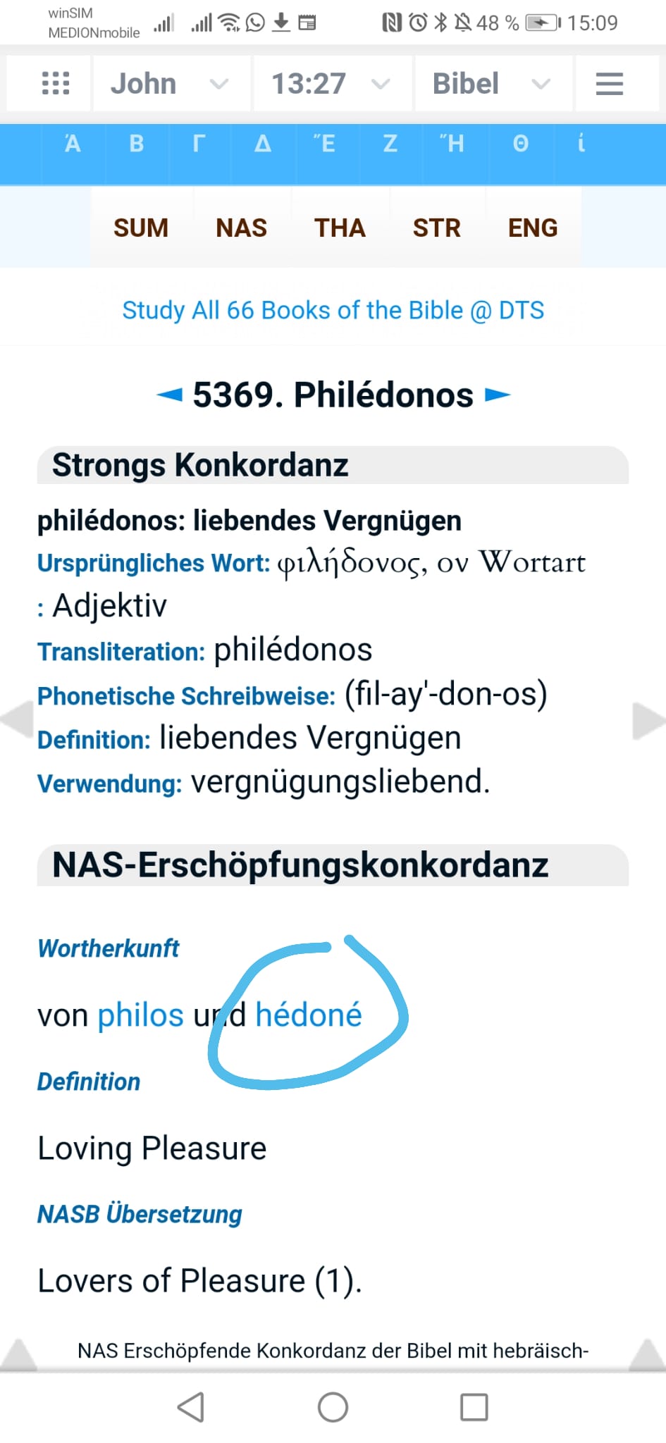 2237 /hēdonḗ ("Befriedigung des körperlichen Appetits") hat eine stark negative Betonung und bezieht sich im Allgemeinen auf Vergnügen, das zum Selbstzweck gemacht wird. Das heißt, die Befriedigung der körperlichen Begierden (Lust) auf Kosten anderer Dinge.